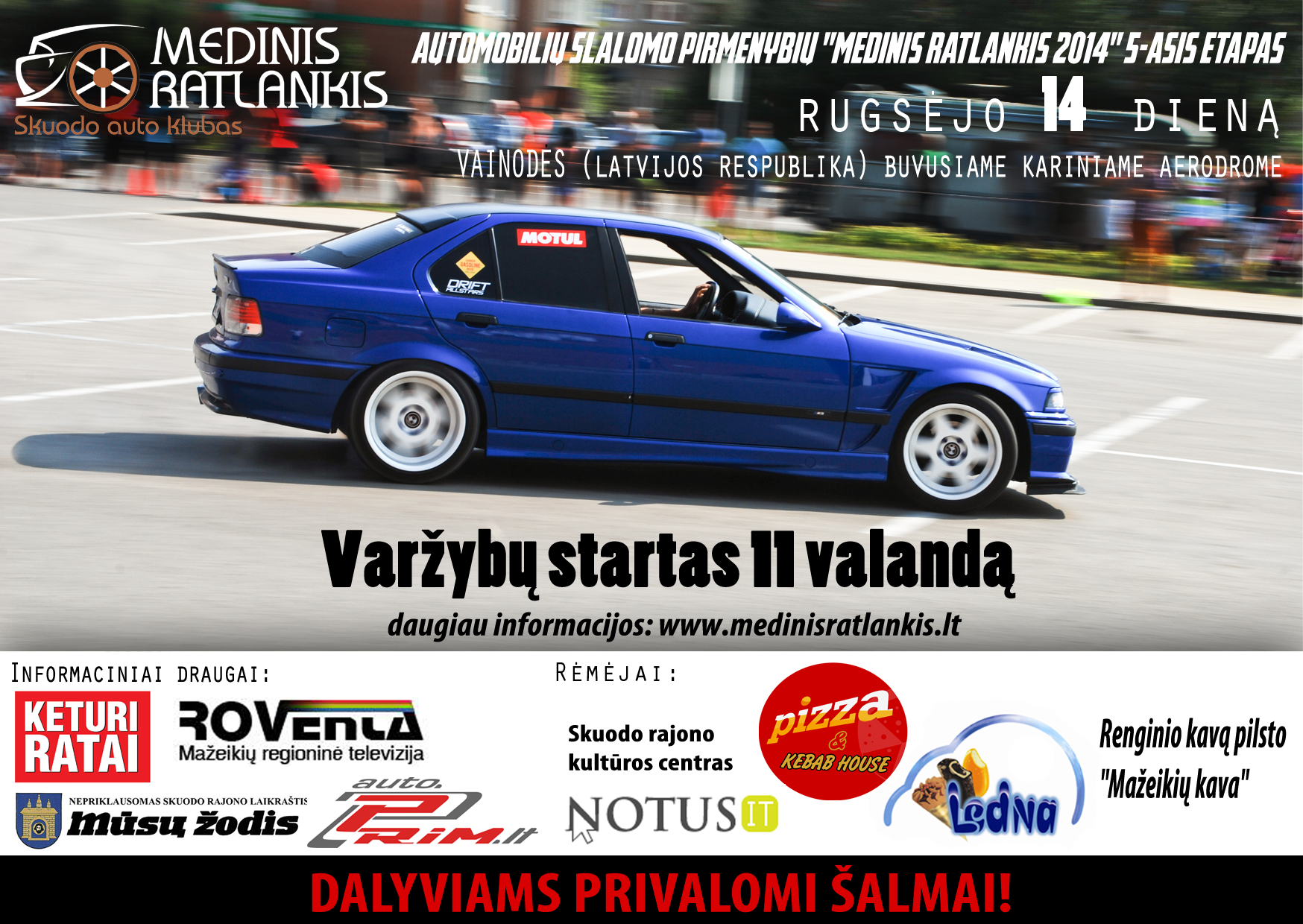 Rugsėjo 14 d. 11 val. Vainiuodės (Latvija) buvusiame kariniame aerodrome įvyks finalinis slalomo pirmenybių „Medinis ratlankis 2014“ etapas. Paskutiniame pirmenybių etape visiems dalyviams yra privalomi auto-moto varžybų reikalavimus atitinkantys saugos šalmai. Jo neturint, nebus galima startuoti. Kaip ir visada, norintys dalyvauti turi užpildyti dalyvio paraišką ir ją atsiųsti el. paštu . Būtina nurodyti, kokiose klasėse bus dalyvaujama.