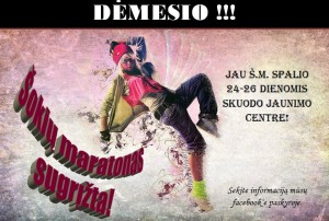 Spalio 24–26 d. Skuodo jaunimo centre rengiamas šokių maratonas „Šo.k – nesusto.k 2014“. Registracija – iki spalio 17 d. Skuodo jaunimo centre (Birutės g. 12). Detalesnė informacija tel. (8-440) 52700. Nugalėtojo laukia įspūdingas prizas – plazminis televizorius. Apdovanoti bus antros ir trečios vietų laimėtojai. Maratone gali dalyvauti asmenys nuo 16-os metų. Nepilnamečiai turi turėti tėvų sutikimą.