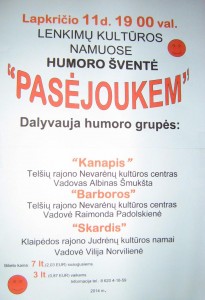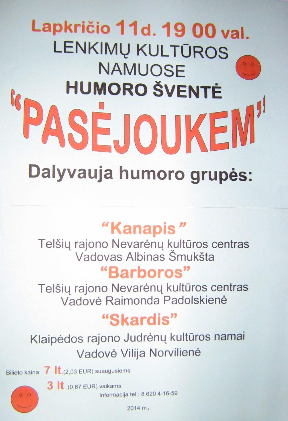 Lapkričio 11 d. 19 val. Lenkimų kultūros centre humoro šventė „Pasijoukem“. Dalyvauja humoro grupės „Kanapis, „Barboras“, „Skardis“. (Skuodo r. kultūros centro Lenkimų skyrius).