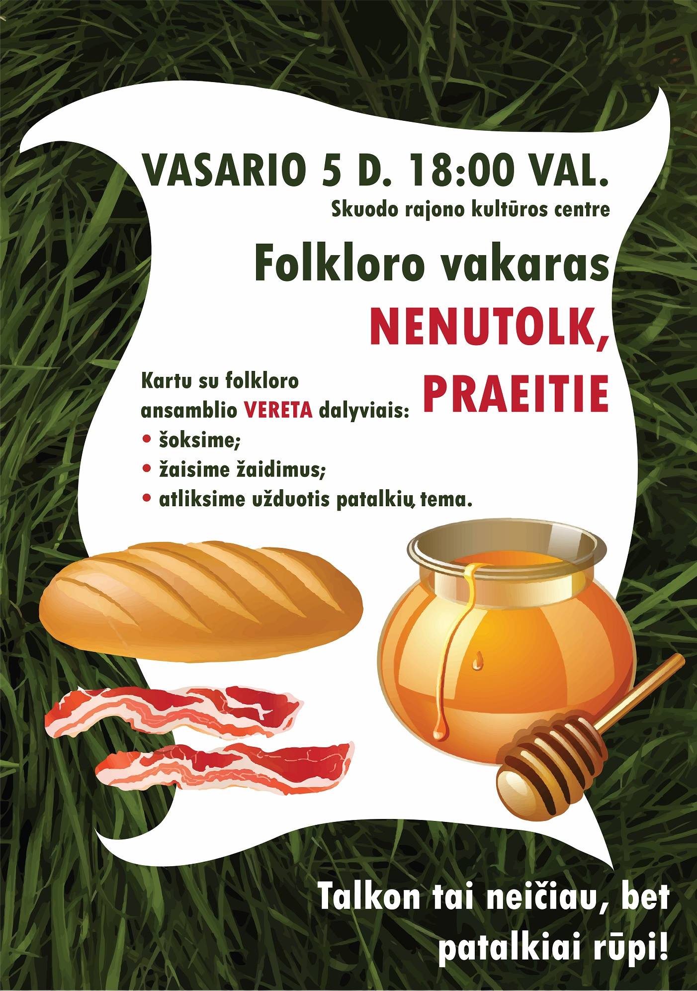 Vasario 5 d. 18 val. Skuodo rajono kultūros centras kviečia į vakarą „Nenutolk, praeitie“. Kartu su folkloro ansamblio „Vereta“ dalyviais bus prisimenamos žemaitiškų patalkių tradicijas, šokama, žaidžiama, atliekamos užduotys. Nenutolkime nuo mūsų bočių sukurtų tradicijų, papročių ir ateikime prie to prisiliesti patys.