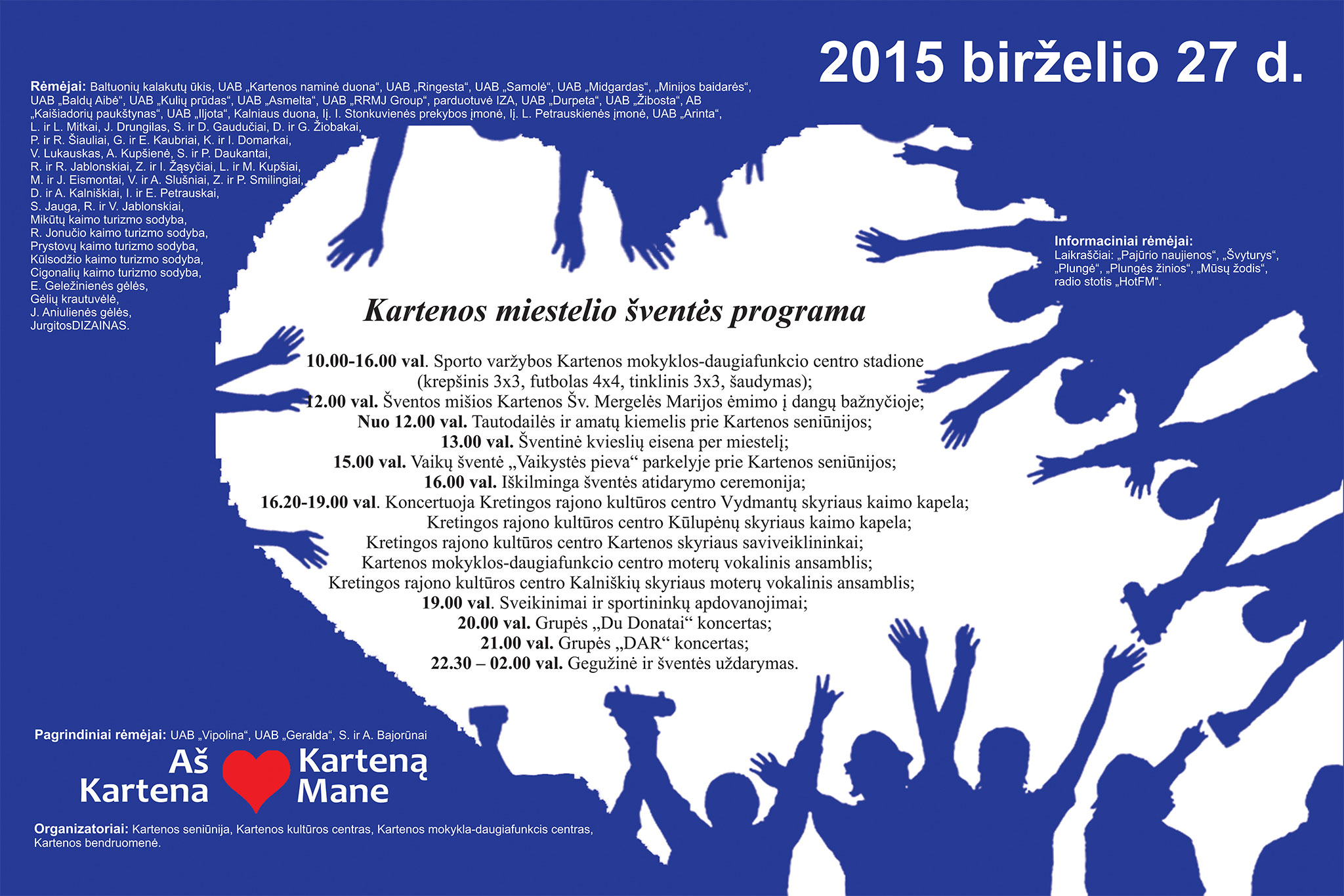 Kartenoje birželio 27 d. Kartenoje vyks miestelio šventė. Programoje: 10–16 val. – sporto varžybos Kartenos mokyklos-daugiafunkcio centro stadione; 12 val. – šv. Mišios Kartenos šv. Mergelės Marijos ėmimo į dangų bažnyčioje; 12 val. – tautodailės ir amatų kiemelis prie Kartenos seniūnijos; 13 val. – šventinė kvieslių eisena per miestelį; 15 val. –vaikų šventė „Vaikystės pieva“ parkelyje prie Kartenos seniūnijos; 16 val. – iškilminga šventės atidarymo ceremonija; 16.20–19.00 val. koncertuos Kretingos rajono kultūros centro Vydmantų skyriaus kaimo kapela; Kretingos rajono kultūros centro Kūlupėnų skyriaus kaimo kapela; Kretingos rajono kultūros centro Kartenos skyriaus saviveiklininkai; Kartenos mokyklos-daugiafunkcio centro moterų vokalinis ansamblis; Kretingos rajono kultūros centro Kalniškių skyriaus moterų vokalinis ansamblis; 19 val. – sveikinimai ir sportininkų apdovanojimai; 20 val. – grupės „Du Donatai“ koncertas; 21 val.– grupės „DAR“ koncertas; 22.30–2 val. – gegužinė ir šventės uždarymas.