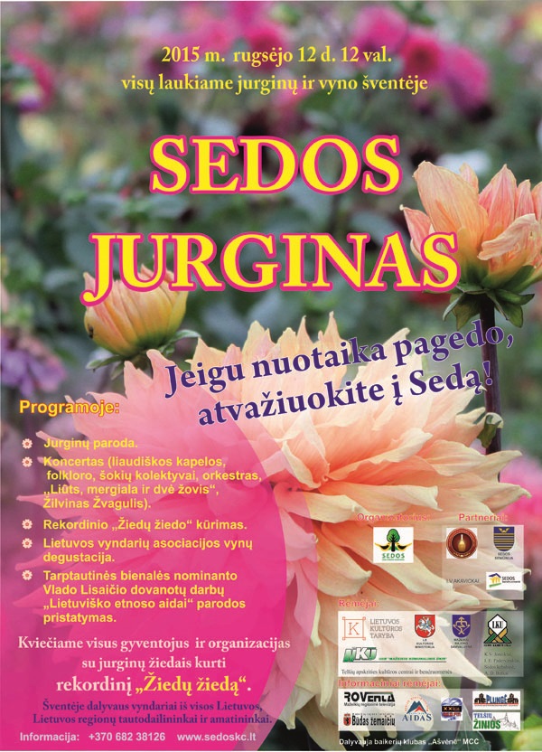 Rugsėjo 12 d. 12 val. Sedoje (Mažeikių r.) – jurginų ir vyno šventė „Sedos jurginas“. Programoje: jurginų paroda; koncertas (liaudiškos kapelos, folkloro, šokių kolektyvai, orkestras, grupė „Liūts, mergiala ir dvė žovis“, Žilvinas Žvagulis); rekordinio „Žiedų žiedo“ kūrimas; Lietuvos vyndarių asociacijos vynų degustacija; tarptautinės bienalės nominanto Vlado Lisaičio dovanotų darbų „Lietuviško etnoso aidai“ parodos pristatymas. Gyventojai ir organizacijos kviečiamos iš jurginų žiedų kurti rekordinį „Žiedų žiedą“.