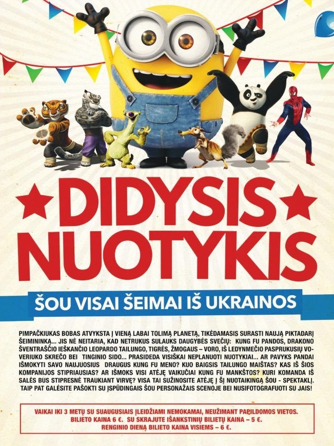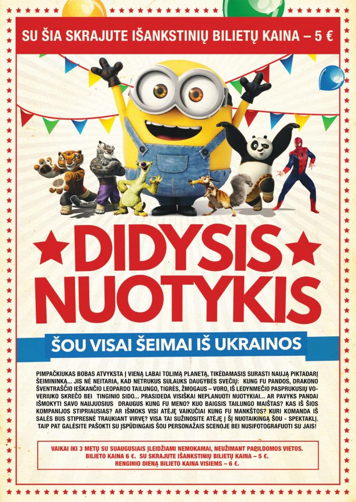 „Didysis nuotykis“ – šou visai šeima iš Ukrainos 2015-11-03 | (0) Tik dabar visi geriausių animacinių filmų herojai vienoje vietoje! Spektaklis Skuodo kultūros centre – lapkričio 6 d. 18 val. Įgarsinta lietuviškai. Prenumeruokite „Mūsų žodį“ 2026-iems metams