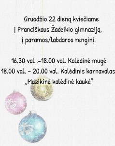 Skuodo P. Žadeikio gimnazijos taryba gruodžio 22 d. visus buvusius mokinius, tėvelius, draugus maloniai kviečia į kalėdinius renginius gimnazijoje. Programoje: 16.30 val. – kalėdinių dirbinių mugė, 18 val. – šventinis vakaras „Kalėdinė muzikinė kaukė“.