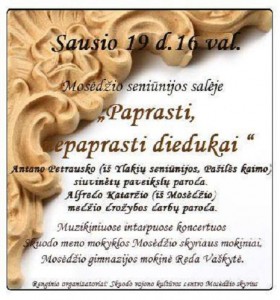 Sausio 19 d. 16 val. Mosėdžio seniūnijos salėje – „Paprasti nepaprasti diedukai“: Antano Petrausko (iš Pašilės kaimo) siuvinėtų paveikslų paroda, Alfredo Kataržio (iš Mosėdžio) medžio drožybos darbų paroda. Koncertuos Skuodo meno mokyklos Mosėdžio skyriaus mokiniai, Mosėdžio gimnazijos mokinė Reda Vaškytė. Renginio organizatorius – Skuodo rajono kultūros centro Mosėdžio skyrius.