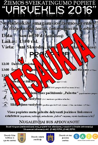 Žiemos sveikatingumo šventė „Varveklis 2016“ – atšaukiama 2016-01-28 | (0) Šį šeštadienį turėjusi įvykti žiemos sveikatingumo šventė „Varveklis 2016“ atšaukiama dėl nepalankaus oro ir nukeliama vėlesniam laikui. Ši šventė lauks tikros žiemos. Apie ją bus paskelbta spaudoje – sekite ją. Prenumeruokite „Mūsų žodį“ 2026-iems metams