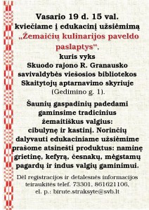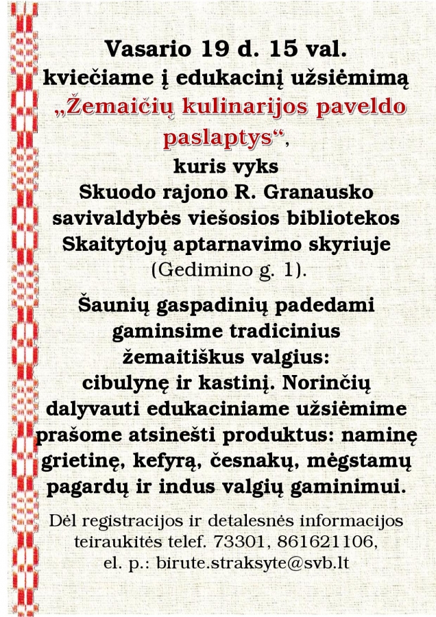 Vasario 19 d. 15 val. kviečiama į edukacinį užsiėmimą „Žemaičių kulinarijos paveldo paslaptys“, kuris vyks Skuodo rajono R. Granausko savivaldybės viešosios bibliotekos Skaitytojų aptarnavimo skyriuje (Gedimino g. 1, Skuodas). Šaunių šeimininkių padedami, gaminsime tradicinius žemaitiškus valgius cibulynę ir kastinį. Norinčių dalyvauti edukaciniame užsiėmime prašome atsinešti produktų: naminės grietinės, kefyro, česnakų, mėgstamų pagardų ir indus valgiams gaminti. Registruotis ir detalesnės informacijos teirautis tel.: (8 440) 73 301, 8 616 21 106; el. p. .