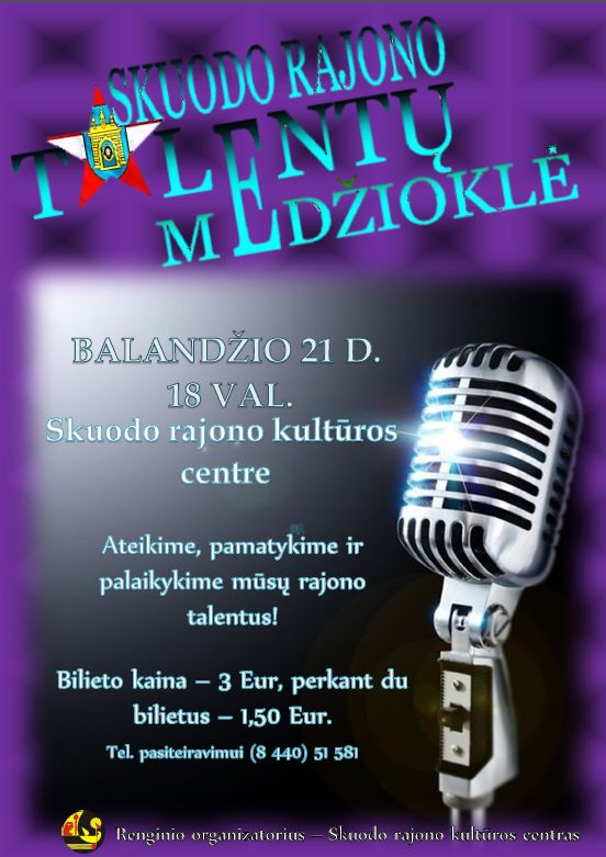 Skuodo rajono talentų medžioklė 2016-04-19 | (0) Balandžio 21 d. 18 val. Skuodo rajono kultūros centre vyks mokamas pramoginis renginys „Skuodo rajono talentų medžioklė“. Kviečiami ateiti, pamatyti ir palaikyti savo rajono talentus! Prenumeruokite „Mūsų žodį“ 2026-iems metams