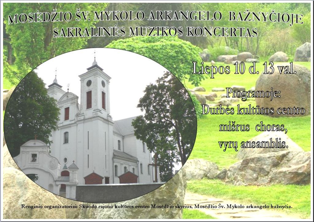 Liepos 10 d.13 val. Mosėdžio šv. Mykolo arkangelo bažnyčioje – sakralinės muzikos koncertas. Koncertuos Durbės kultūros centro mišrus choras, vyrų ansamblis. Renginio organizatoriai: Skuodo rajono kultūros centro Mosėdžio skyrius, Mosėdžio šv. Mykolo arkangelo bažnyčia.