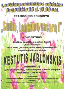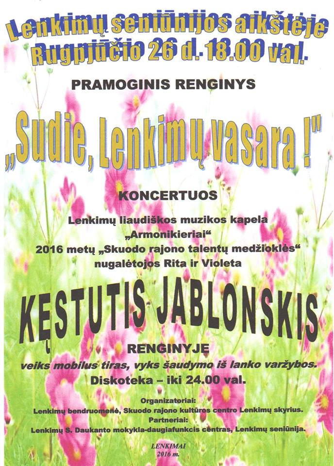 Rugpjūčio 26 d. 18 val. Lenkimų seniūnijos aikštėje – pramoginis renginys „Sudie, Lenkimų vasara“. Vyks šaudymo iš lanko varžybos, koncertuos Lenkimų liaudiškos muzikos kapela „Armonikieriai“, 2016 m. Skuodo rajono talentų medžioklės nugalėtojos Rita ir Violeta bei dainininkas, daugelio šlagerių autorius Kęstutis Jablonskis. Organizatoriai: Lenkimų bendruomenė, Skuodo r. kultūros centro Lenkimų skyrius; partneris – Lenkimų S. Daukanto mokykla-daugiafunkcis centras.