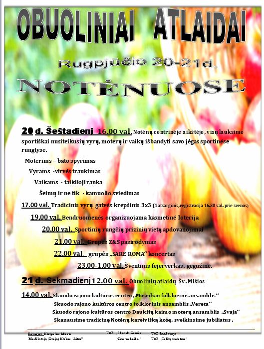 - 20 d. (šeštadienį) 16.00 val. Notėnų centrinėje aikštėje lauksime sportiškai nusiteikusių vyrų, moterų ir vaikų išbandyti savo jėgas sportinėse rungtyse: moterims – bato spyrimas; vyrams – virvės traukimas; vaikams – taiklioji ranka; šeimoms ir ne tik – kamuolio sviedimas.