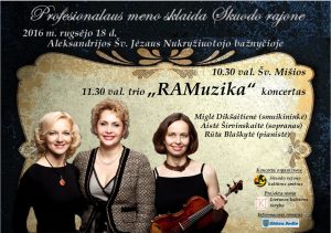Rugsėjo 18 d. Aleksandrijos bažnyčioje vyks šv. Kryžiaus Išaukštinimo tituliniai atlaidai. 10.30 val. – šv. Mišios. Po jų – sakralinės muzikos koncertas. Koncertuos trio „RAMuzika“ Smuikininkė M. Dikšaitienė, pianistė R. Blaškytė ir sopranas A. Širvinskaitė.