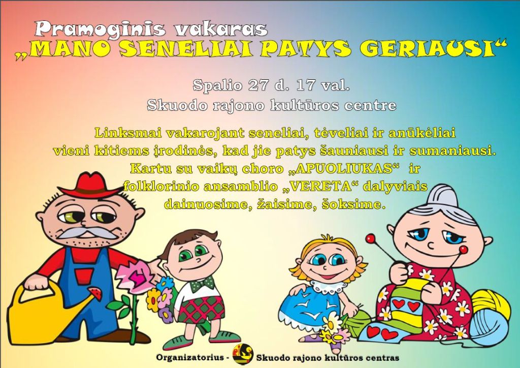 Spalio 27 d. 17 val. Skuodo rajono kultūros centre vyks pramoginis vakaras „Mano seneliai patys geriausi“. Linksmai vakarodami seneliai, tėveliai ir anūkėliai vieni kitiems įrodinės, kad jie patys šauniausi ir sumaniausi. Kartu su vaikų choro „Apuoliukas“ ir folkloro ansamblio „Vereta“ dalyviais bus dainuojama, žaidžiama, šokama.