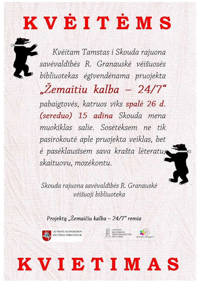 Spalio 26 d. 15 val. Skuodo meno mokyklos salėje – unikalaus Skuodo rajono savivaldybės R. Granausko viešosios bibliotekos projekto „Žemaičių kalba – 24/7“ užbaigtuvių šventė. Joje netrūks nei muzikos, nei autorinės žemaitiškos kūrybos, nes į renginį susirinks pagal projektą skuodiškių sukurtame internetiniame portale, skirtame žemaičių kalbai puoselėti ir propaguoti, publikuojamos kūrybos autoriai iš visos Lietuvos. Iškilmingose užbaigtuvėse laukiami ne tik žemaičiai – visi skuodiškiai bei rajono gyventojai.