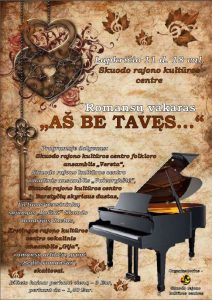 Lapkričio 11 d. 18 val. Skuodo rajono kultūros centre – romansų vakaras „AŠ BE TAVĘS…“. Programoje dalyvaus: Skuodo rajono kultūros centro folkloro ansamblis „Vereta“, vokalinis ansamblis „Vaivorykštė“, Barstyčių skyriaus ir LPS „Bočiai“ Skuodo bendrijos duetai, Kretingos rajono kultūros centro vokalinis ansamblis „Gija“ bei atlikėjų grupė „Sedos romansai“, skaitovai. Bilietų kainos perkant du – po 1,50 Eur, vieną – 3 Eur.