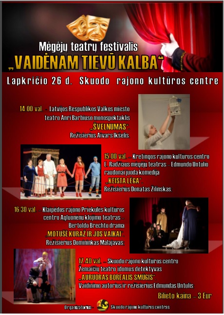 Lapkričio 26 d. 14 val. Skuodo kultūros centre prasidės XVII tradicinis tarptautinis mėgėjų teatrų festivalis „Vaidėnam tievū kalba“. Šį kartą jame dalyvaus Latvijos Respublikos Valkos miesto teatras su monospektakliu „Švelnumas“ pagal A. Barbiuso novelę (režisierius Aivaras Ikšelis); Kretingos kultūros centro E. Radžiaus teatras su juodai raudona E. Untulio komedija „Keista lėga“ (režisierius Donatas Žilinskas); Priekulės kultūros centro Agluonėnų klojimo teatras su Bertolto Brechto drama „Motušė Kuraž ir jos vaikai“ (režisierius Domininkas Malajavas). Festivalį užbaigs Skuodo kultūros centro žemaičių teatras. Skuodiškiai suvaidins E. Untulio parašytą ir pastatytą „majiedni detektīva“ – „Auruoras borealis smūgis“.