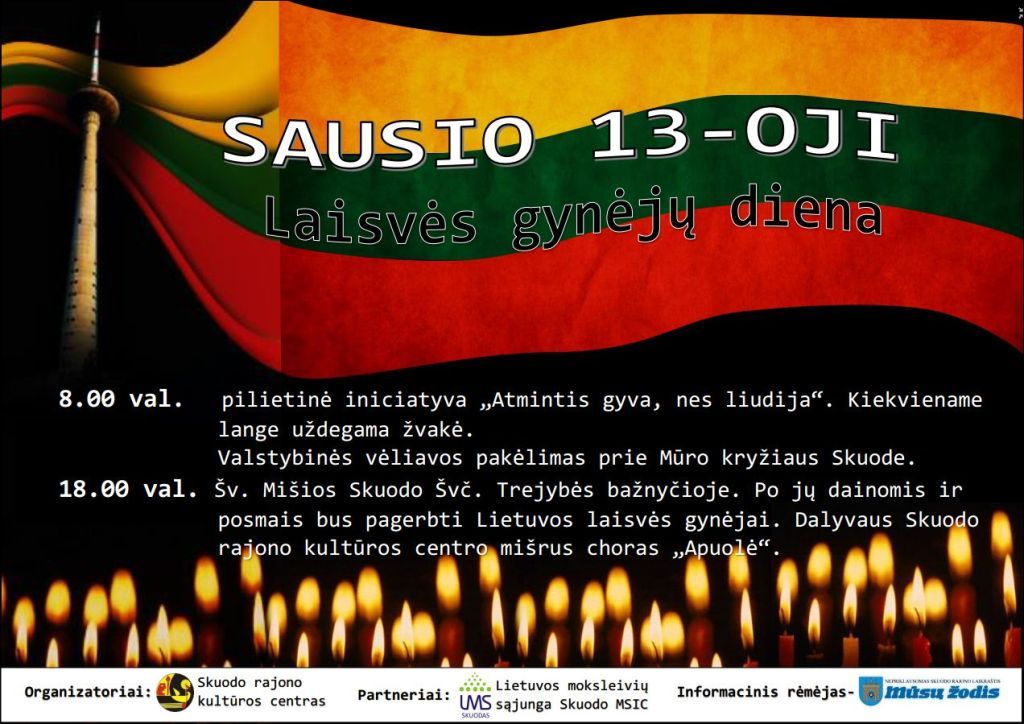 Sausio 13 d. 8 val. – pilietinė iniciatyva „Atmintis gyva, nes liudija“ (kiekviename lange uždegama žvakė), Valstybinės vėliavos pakėlimas prie Mūro kryžiaus Skuode; 18 val. – šv. Mišios Skuodo Švč. Trejybės bažnyčioje. Po jų dainomis ir posmais bus pagerbti Lietuvos laisvės gynėjai. Dalyvaus Skuodo rajono kultūros centro mišrus choras „Apuolė“.