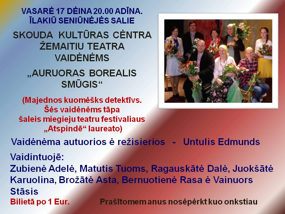 Vasarė 17 dėina 20 adīna Īlakiū seniūnėjės salie – Skouda kultūras cėntra Žemaitiu tetra vaidėnėms „Auruoras Borealis smūgis“ (majednos kuomėšks detektīvs; tas vaidėnėms tapa šalėis miegieju teatru festivalė „Atspindē“ laureto). Bilietā – po1 Eur. Prašītomem anus nosėpėrktė kuo onkstiau. Vaidėnėma autuorios ėr režisierios – Untulis Edmunds.