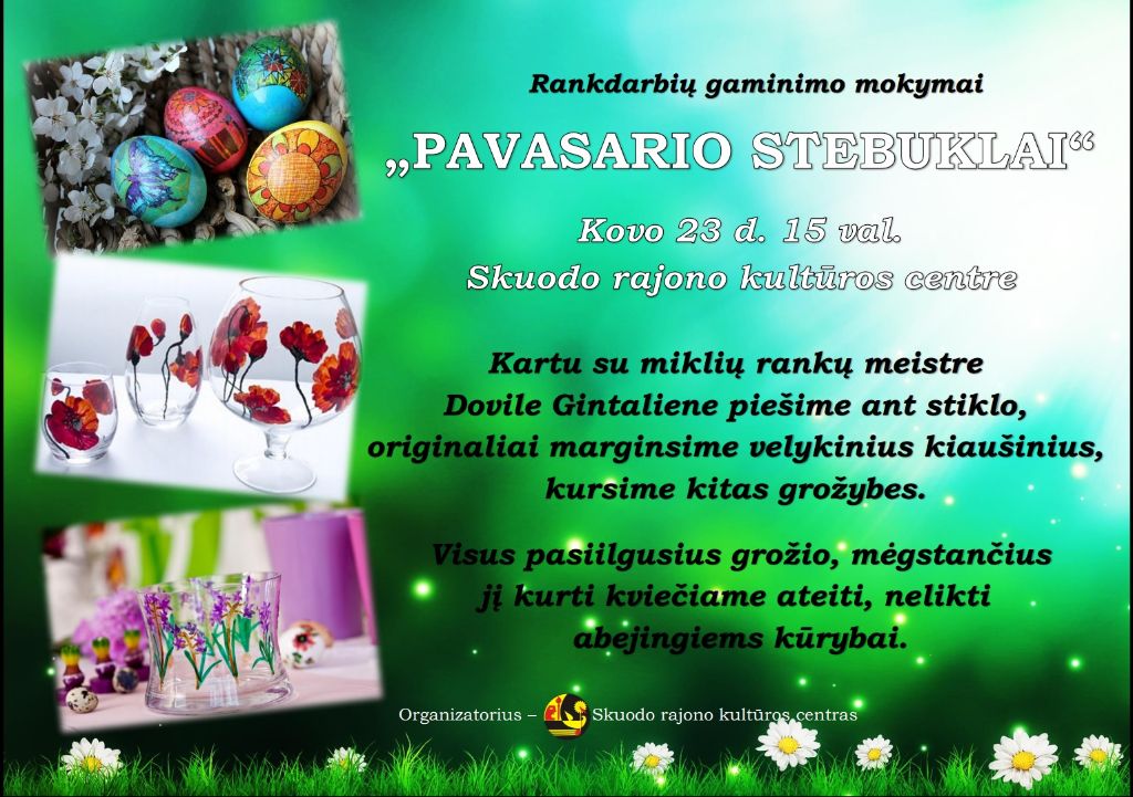 Kovo 23 d. 15 val. pasiilgę grožio ir mėgstantys jį kurti kviečiami į rankdarbių gaminimo mokymus „Pavasario stebuklai“, kurie vyks Skuodo rajono kultūros centre. Kartu su miklių rankų meistre Dovile Gintaliene bus piešiama ant stiklo, originaliai marginami velykiniai kiaušiniai, kuriamos kitos grožybės.