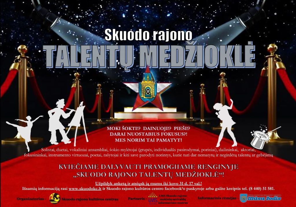 Skuodo rajono kultūros centras kviečia dalyvauti pramoginiame renginyje „Skuodo rajono talentų medžioklė“. Tie, kurie geba ką nors parodyti, privalo užpildyti anketą ir iki kovo 31 d. 17 val. pateikti kultūros centrui. Detalesnė informacija – www.skuodokc.lt, „Facebook“ paskyroje arba tel. (8 440) 51 581.
