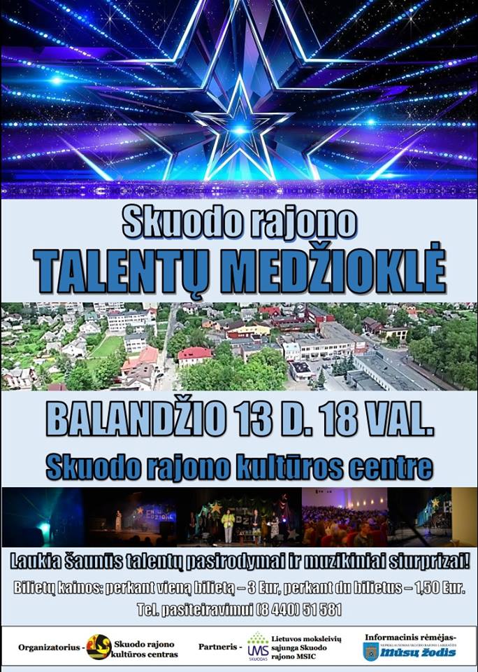 Pramoginis renginys „Skuodo rajono talentų medžioklė“ 2017-04-06 | (0) Balandžio 13 d. 18 val. Skuodo rajono kultūros centre – šaunūs talentingų žmonių pasirodymai ir muzikiniai siurprizai. Bilietų kainos – minimalios. Tel. pasiteirauti (8 440) 51 581. Prenumeruokite „Mūsų žodį“ 2026-iems metams