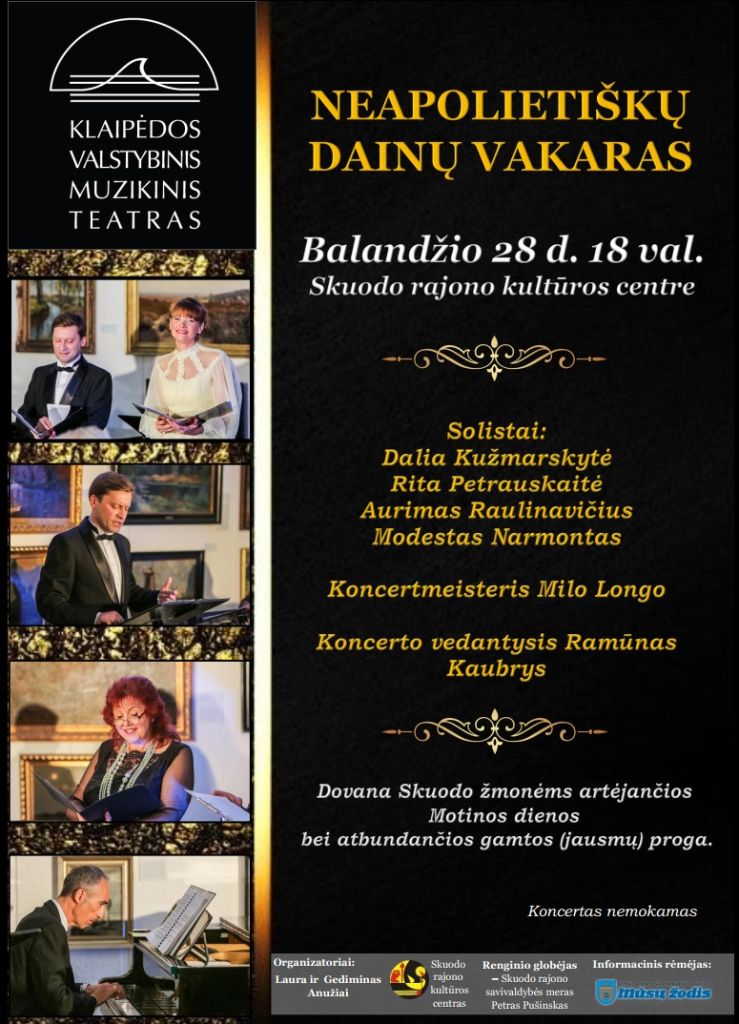 Nemokamas koncertas – neapolietiškų dainų vakaras 2017-04-20 | (0) Balandžio 28 d. 18 val. Skuodo rajono kultūros centre vyks neapolietiškų dainų vakaras. Tai dovana Skuodo žmonėms artėjančios Motinos dienos bei atbundančios gamtos (jausmų) proga. Prenumeruokite „Mūsų žodį“ 2026-iems metams