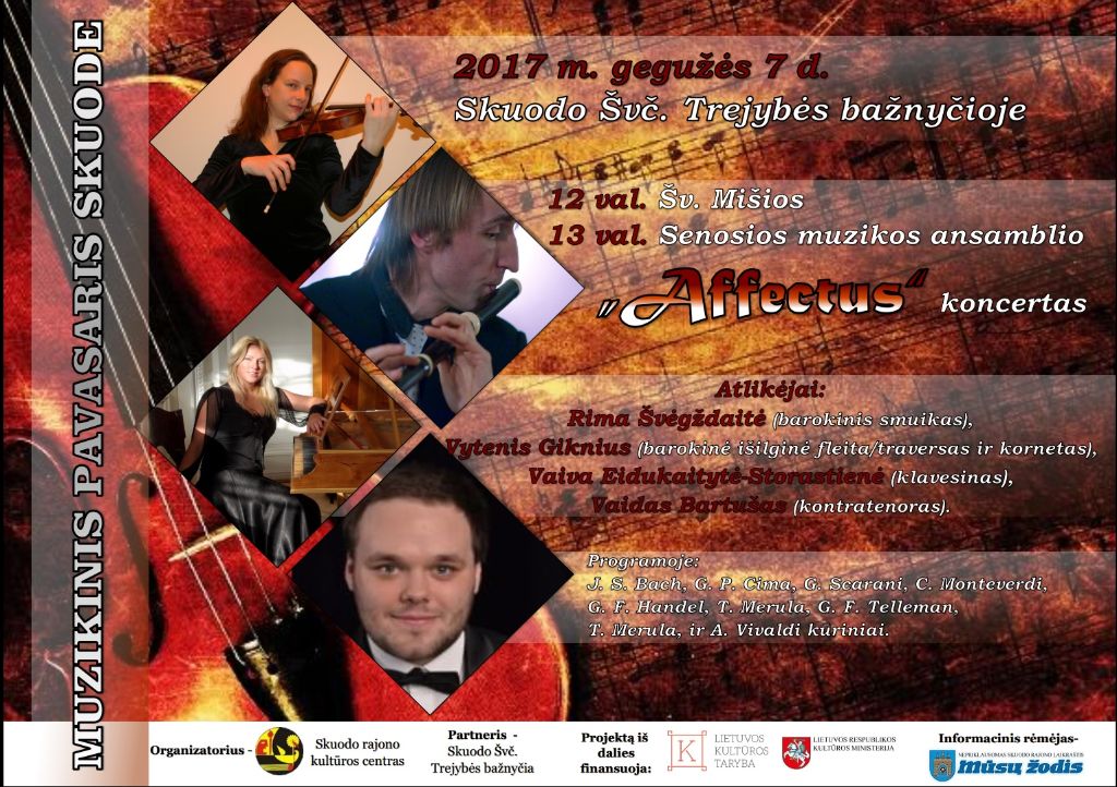 Gegužės 7 d. 13 val. (po šv. Mišių) Skuodo Švč. Trejybės bažnyčioje – senosios muzikos ansamblio „Affectus“ koncertas. Dalyvaus Rima Švėgždaitė (barokinis smuikas), Vytenis Giknius (barokinė išilginė fleita/traversas ir kornetas), Vaiva Eidukaitytė-Storastienė (klavesinas) ir Vaidas Bartušas (kontratenoras), kurie atliks žymių kompozitorių kūrinius.