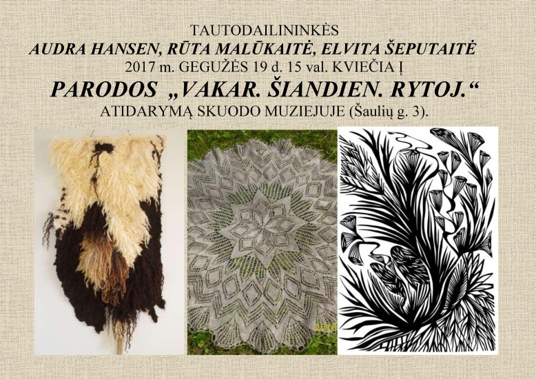 Tautodailininkių kūrybos darbų paroda 2017-05-15 | (0) Gegužės 19 d. 15 val. maloniai kviečiama į trijų tautodailininkių – Audros Hansen, Rūtos Malūkaitės ir Elvitos Šeputaitės – kūrybos darbų parodos „Vakar. Šiandien. Rytoj“ Skuodo muziejuje atidarymą. Prenumeruokite „Mūsų žodį“ 2026-iems metams