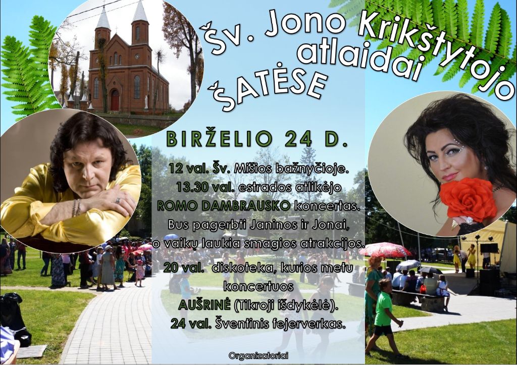 Joninių šventė Šatėse 2017-06-19 | (0) Birželio 24 d. (šeštadienį) Šatėse – Šv. Jono atlaidų šventė: 12 val. – šv. Mišios, 14 val. – Romo Dambrausko koncertas. Veiks atrakcionai vaikams. 20 val. gegužinėje koncertuos Aušrinė – „Tikroji išdykėlė“, 24 val. – šventiniai fejerverkai. Prenumeruokite „Mūsų žodį“ 2026-iems metams