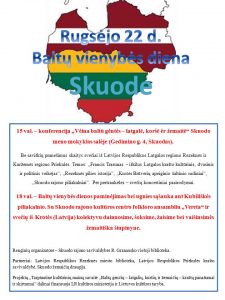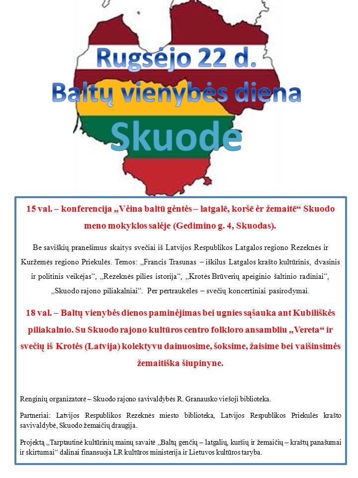 Rugsėjo 22-ąją švęsime Baltų vienybės dieną. 15 val. Skuodo meno mokyklos salėje (Gedimino g. 4) – konferencija „Vėina baltū gėntės – latgalē, koršē ėr žemaitē“. Pranešimus skaitys ne tik saviškiai, bet ir svečiai iš Latvijos Respublikos Latgalos regiono Rezeknės bei Kuržemės regiono Priekulės. Per pertraukėles – svečių koncertiniai pasirodymai. 18 val. ant Kubiliškės piliakalnio – Baltų vienybės dienos paminėjimas ir ugnies sąšauka. Kartu su Skuodo rajono kultūros centro folkloro ansambliu „Vereta“ bei svečių iš Krotės (Latvija) kolektyvu bus dainuojama, šokama, žaidžiama, vaišinamasi žemaitiška šiupinyne. Renginių organizatorius – Skuodo rajono savivaldybės R. Granausko viešoji biblioteka. Partneriai: Latvijos Respublikos Rezeknės miesto biblioteka, Priekulės krašto savivaldybė, Skuodo žemaičių draugija. Projektą „Tarptautinė kultūrinių mainų savaitė „Baltų genčių – latgalių, kuršių ir žemaičių – kraštų panašumai ir skirtumai“ dalinai finansuoja LR kultūros ministerija ir Lietuvos kultūros taryba.