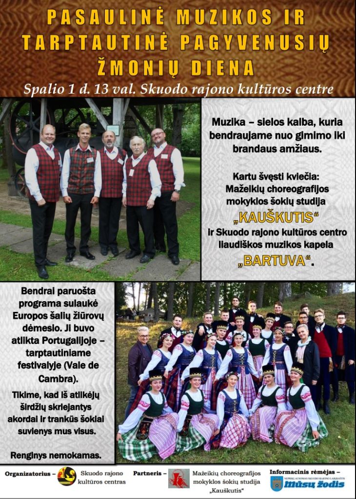 Spalio 1-oji – Pasaulinė muzikos ir Tarptautinė pagyvenusių žmonių diena. Jei norite ją paminėti ypač linksmai, tą dieną 13 val. esate laukiami Skuodo rajono kultūros centre. Kartu švęsti kviečia Mažeikių choreografijos mokyklos šokių studija „Kauškutis“ ir Skuodo rajono kultūros centro liaudiškos muzikos kapela „Bartuva“. Bendrai paruošta programa sulaukė Europos šalių žiūrovų dėmesio. Ji buvo atlikta Portugalijoje įvykusiame tarptautiniame festivalyje (Vale de Cambra).