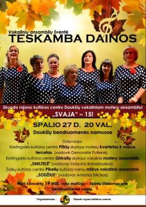 Spalio 27 d. 20 val. Daukšių bendruomenės namuose – vokalinių ansamblių šventė „Teskamba dainos“. Joje dalyvaus Kretingalės kultūros centro Plikių skyriaus moterų kvartetas ir mišrus tercetas, to paties kultūros centro Girkalių skyriaus moterų vokalinis ansamblis „Smiltelė“,. Židikų kultūros centro Pikelių kultūros namų mišrus vokalinis ansamblis „Sodžius“ bei Skuodo rajono kultūros centro Daukšių moterų vokalinis ansamblis „Svaja“. Prieš koncertą prie bendruomenės namų bus įžiebti žibintai – moliūgai.