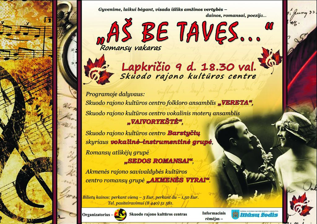 Romansų vakaras „Aš be tavęs…“ 2017-10-30 | (0) Lapkričio 9 d. 18 val. – romansų vakaras „Aš be tavęs…“ Skuodo rajono kultūros centre. Organizatoriai pasilieka teisę keisti renginio datą ir laiką. Prenumeruokite „Mūsų žodį“ 2026-iems metams