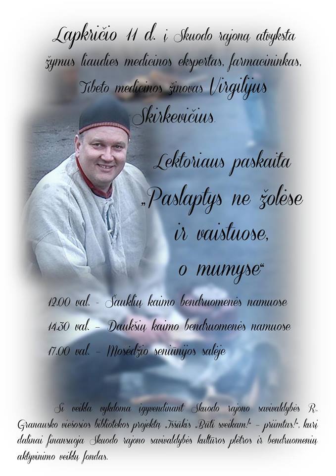 Įgyvendinant Skuodo rajono savivaldybės R. Granausko viešosios bibliotekos projektą „Iššūkis „Būti sveikam!“ – priimtas!“, kurį dalinai finansuoja Skuodo rajono savivaldybės kultūros plėtros ir bendruomenių aktyvinimo veiklų fondas, lapkričio 11 d. į Skuodo rajoną atvyks žymus liaudies medicinos ekspertas, farmacininkas, Tibeto medicinos žinovas Virgilijus Skirkevičius. Jo paskaita „Paslaptys ne žolėse ir vaistuose, o mumyse“ vyks: 12 val. – Šauklių kaimo bendruomenės namuose; 14.30 val. – Daukšių kaimo bendruomenės namuose; 17 val. – Mosėdžio seniūnijos salėje.