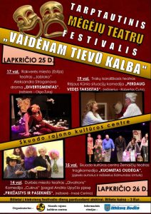 Lapkričio 25–26 d. Skuodo kultūros centre – Tarptautinis mėgėjų teatrų festivalis „Vaidėnam tievū kalba“. Lapkričio 25 d.: 17 val. Rakverės miesto (Estija) teatras „Jabloko“ parodys Aleksandro Stroganovo dramą „Divertismentas“ (režisierė Olga Žulaj); 19 val. Trakų karališkasis teatras – Rėjaus Kūnio situacijų komediją „Per daug vedęs taksistas“ (režisierius Robertas Čuta). Lapkričio 26 dieną: 14 val. Durbės miesto teatras „Divatrons“ parodys komediją „Cukrus“ pagal Andrio Upyčio pjesę „Priežastys ir pasekmės“ (režisierė Inesė Cerinia); 15 val. Skuodo rajono kultūros centro Žemaičių teatras – tragikomediją „Kuometas oudėga“ (pjesės autorius ir režisierius Edmundas Untulis). Bilietai parduodami į kiekvieną festivalio dieną atskirai. Kaina – 3 Eur.