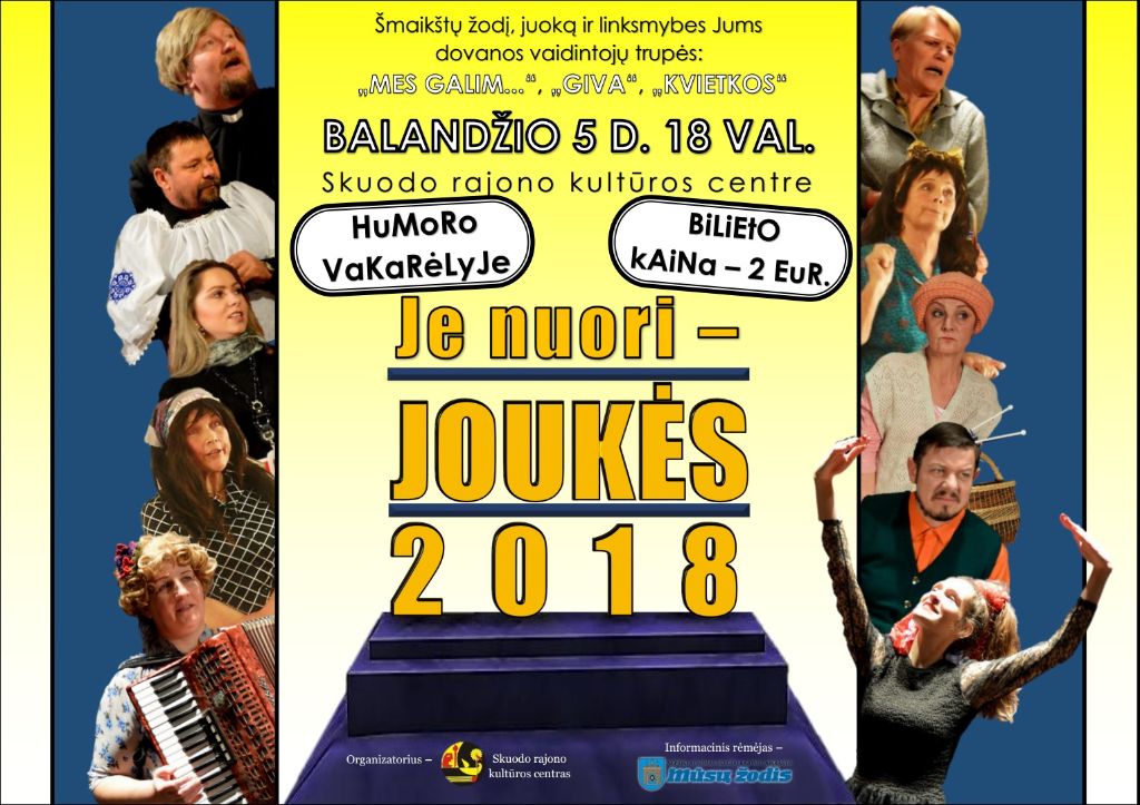 Balandžio 5 d. 18 val. Skuodo rajono kultūros centras kviečia į vakarą „Je nuori – joukės“. Šmaikštų žodį, juoką ir linksmybes dovanos vaidintojų trupės „Mes galim…“, „Gīvā“ ir nepakartojamos „Kvietkas“ iš Šatraminių. Kviečiama „užsidėti“ šventines šypsenas ir atsivesti namisėdą kaimyną. Bilieto kaina juokingai maža – tik 2 eurai.