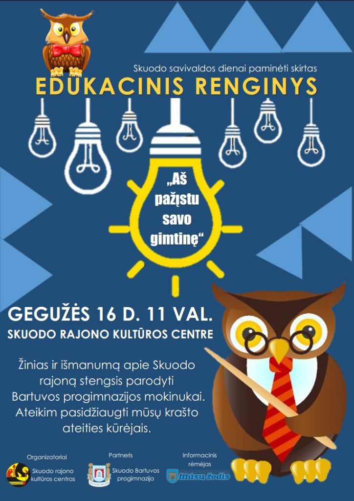 Gegužės 16 d. 11 val. Skuodo rajono kultūros centre – edukacinis renginys, skirtas Skuodo savivaldos dienai paminėti „Aš pažįstu savo gimtinę“. Žinias apie Skuodo rajoną stengsis parodyti Bartuvos progimnazijos mokiniai. Ateikime pasidžiaugti mūsų krašto ateities kūrėjais.