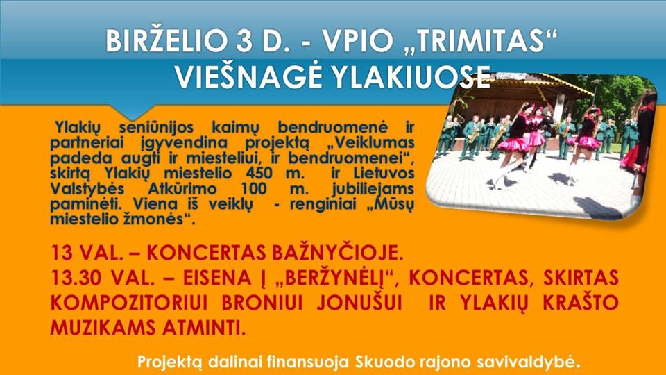 Ylakių seniūnijos kaimų bendruomenė ir partneriai įgyvendina projektą „Veiklumas padeda augti ir miesteliui, ir bendruomenei“, skirtą Ylakių miestelio 450-osioms metinėms ir Lietuvos valstybės atkūrimo 100-mečio jubiliejui paminėti. Viena iš veiklų – renginiai „Mūsų miestelio žmonės“. Birželio 3 d. 13 val. – „Trimito“ koncertas bažnyčioje, 13.30 val. – eisena į „Beržynėlį“, kur vyks koncertas, skirtas kompozitoriui Broniui Jonušui ir Ylakių krašto muzikams atminti. Projektą iš dalies finansuoja Skuodo rajono savivaldybė.