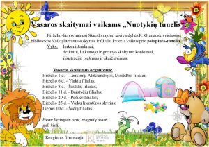Birželio–liepos mėnesį Skuodo rajono savivaldybės R. Granausko viešosios bibliotekos Vaikų literatūros skyrius ir filialai kviečia vaikus prie palapinės. Linksmus žaidimus ir skaitymus „Nuotykių tunelis“ organizuos: birželio 20 d. 15 val. – Pašilės filialas; birželio 25 d. 14 val. – Vaikų literatūros skyrius; liepos 10 d. 10 val. – Šačių filialas. Projekto „Popieriniai knygutyčių labirintai“ renginius finansuoja Lietuvos kultūros taryba. Esant lietingam orui, renginių datos gali kisti. Sekite reklamą savo bibliotekose.