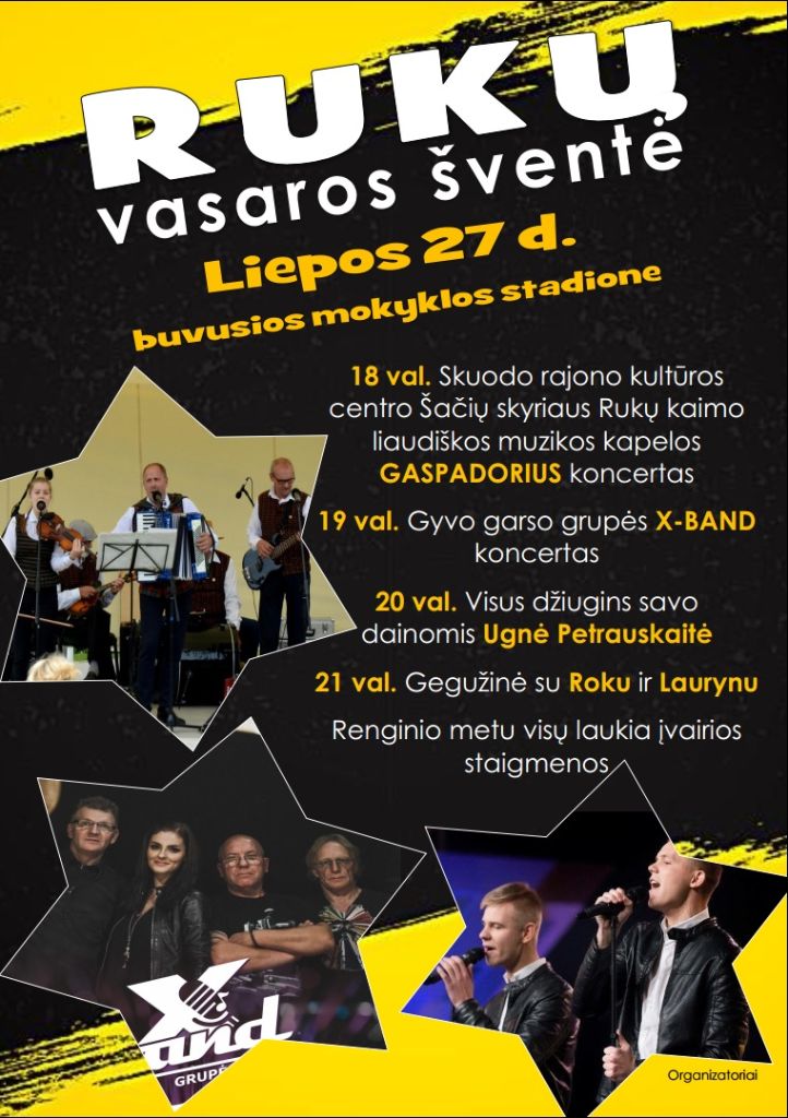 Rukuose liepos 27 d. 18 val. – Vasaros šventė. Programoje: 18 val. – Rukų kaimo kapelos „Gaspadorius” koncertas; 19 val. – gyvo garso grupės „X-BAND” koncertas; 20 val. – dainomis džiugins Ugnė Petrauskaitė; 21 val. – gegužinė su Roku ir Laurynu. renginyje visų laukia įvairios staigmenos.