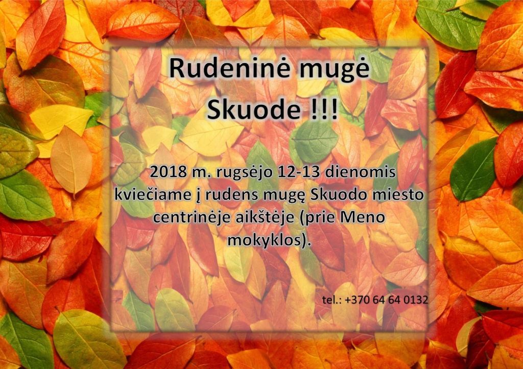 Dviejų dienų rudeninė mugė Skuode 2018-09-06 | (0) Rugsėjo 12–13 dienomis Skuodo miesto centrinėje aikštėje vyks rudeninė mugė. Visus mažus ir didelius miestelėnus bei jų svečius maloniai kviečiama apsilankyti bei sudalyvauti. Daugiau informacijos telefonu +370 646 40 132. Prenumeruokite „Mūsų žodį“ 2026-iems metams