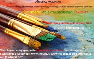 Skuodo rajono savivaldybė skelbia piešinių konkursą Europos paveldo dienoms paminėti „Šimtmečio objektai moksleivių akimis“. Piešinių laukiama iki rugsėjo 28 d. Skuodo meno mokykloje. Visos konkurso sąlygos – konkurso nuostatuose Skuodo rajono savivaldybės svetainėse: www.skouds.lt, www.skuodas.lt, informacija tel. (8 440) 57 307.