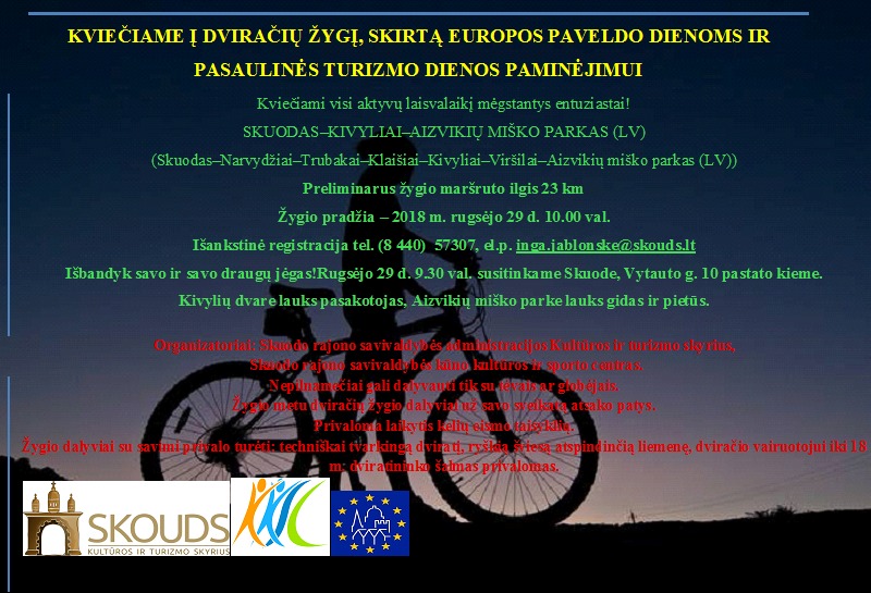 Rugsėjo 29 d. nuo 9.30 val. dviračių sporto mėgėjai renkasi Vytauto g. 10 pastato, esančio Skuode, kieme. Iš čia 10 val. išvykstama į 23 km žygį maršrutu Skuodas–Kivyliai–Aizvikių miško parkas (Latvija). Kivylių dvare lauks pasakotojas, o Aizvikių miško parke – gidas ir pietūs. Išankstinė registracija tel. (8 440) 57 307, el. p. . Nepilnamečiai gali dalyvauti su tėvais ar globėjais. Žygio dalyviai su savimi privalo turėti techniškai tvarkingą dviratį, šviesą atspindinčią liemenę, iki 18-os metų – šalmą. Žygis skiriamas Europos paveldo ir Pasaulinei turizmo dienoms paminėti.