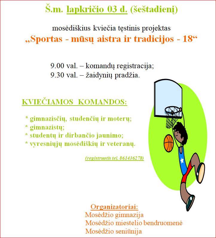 Tradicinis projektas „Sportas – mūsų aistra ir tradicijos“ lapkričio 3 d. (šeštadienį) kviečia į krepšinio turnyrą. Registracija – 9 val., žaidynių pradžia – 9.30 val. Kviečiamos mokinių, studentų, dirbančio jaunimo bei veteranų ir mergaičių, studenčių bei moterų komandos. Projektą įgyvendina Mosėdžio gimnazija su partneriais – Mosėdžio seniūnija ir Mosėdžio miestelio bendruomene. Projektą remia J. ir E. Žukauskai, Mosėdžio seniūnijos verslo įmonės bei ūkininkai. Šiemet projektui sukanka 18 metų, tad į šventinį jo atidarymą kviečiami ne tik žaidėjai, bet ir rėmėjai, svečiai bei sirgaliai.