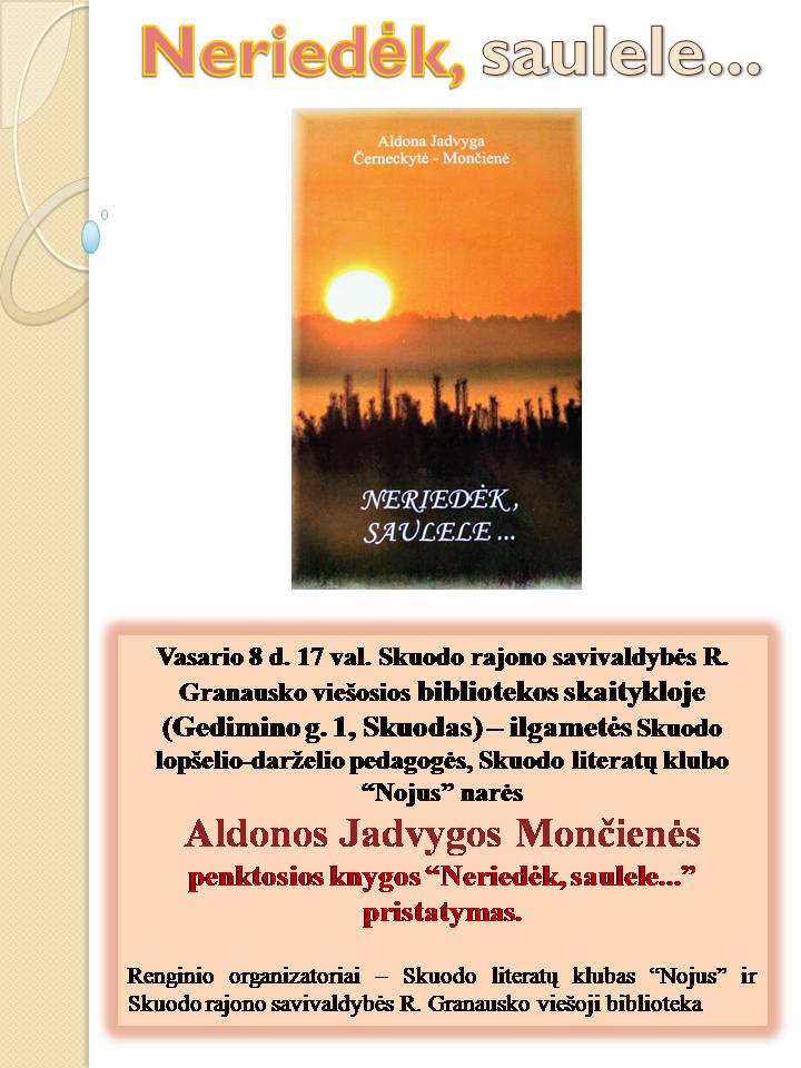 Vasario 8 d. 17 val. Skuodo rajono savivaldybės R. Granausko viešosios bibliotekos skaitykloje (Gedimino g. 1, Skuodas) – ilgametės Skuodo lopšelio-darželio pedagogės, Skuodo literatų klubo „Nojus“ narės Aldonos Jadvygos Mončienės penktosios knygos „Neriedėk, saulele…“ pristatymas. Renginio organizatoriai – Skuodo literatų klubas „Nojus“ ir Skuodo rajono savivaldybės R. Granausko viešoji biblioteka.