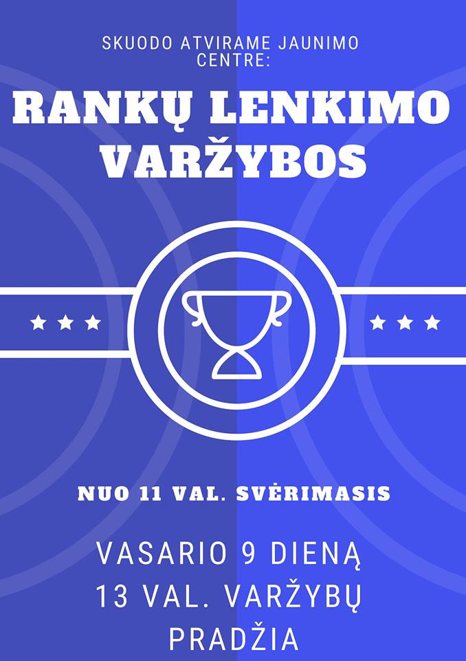 Vasario 9 d. (šeštadienį) Skuodo atvirame jaunimo centre (P. Cvirkos g. 9) vyks atviros Skuodo krašto rankų lenkimo pirmenybės. Dalyvių registracija ir svėrimas – nuo 11 iki 12.30 val. Varžybų pradžia – 13 val.