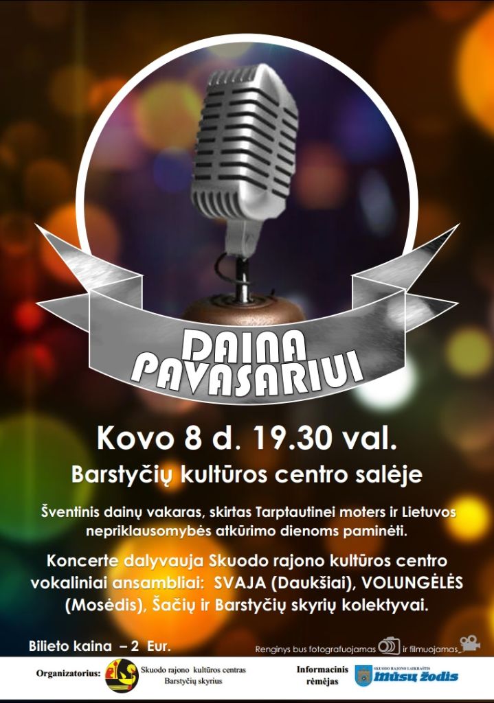 Kovo 8 d. 19.30 val. Barstyčių kultūros centro salėje (mokykloje) – šventinis vakaras „Daina pavasariui“, skirtas Tarptautinei moters dienai ir Kovo 11-ajai paminėti. Koncertuos Skuodo rajono kultūros centro vokaliniai kolektyvai iš Daukšių, Šačių ir Barstyčių skyrių, Mosėdžio „Volungėlė“ bei folkloro kolektyvas „Vereta“ iš Skuodo. Bilieto kaina – 2 Eur.
