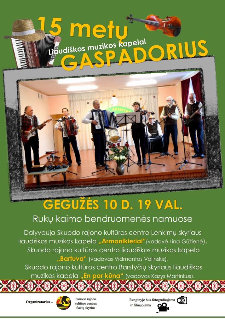Jau 15 metų rajone ir už jo ribų žinoma Skuodo rajono kultūros centro Šačių skyriaus Rukų kaimiška kapela „Gaspadorius“ (kolektyvo įsteigėjas ir vadovas Gintautas Petrauskas) mini gražią sukaktį ir gegužės 10 d. 19 val. kviečia į koncertą, kuris vyks Rukų kaimo bendruomenės salėje. Dalyvaus Skuodo rajono kultūros centro kolektyvai: liaudiškos muzikos kapela „Bartuva“ (vadovas Vidmantas Valinskis), Lenkimų skyriaus liaudiškos muzikos kapela „Armonikieriai“ (vadovė Lina Gūžienė), Barstyčių skyriaus liaudiškos muzikos kapela „Ēn par kūna“ (vadovas Kazys Martinkus).