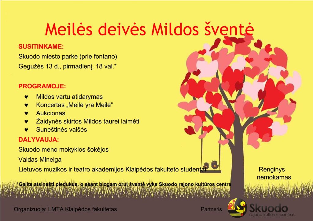 Galbūt nauja Skuodo tradicija tapsiančios šventės pradžia – 18 val. Žiūrovai kviečiami tapti aktyviais renginio dalyviais – dainuoti ir šokti drauge su atlikėju Vaidu Minelga bei Skuodo rajono kultūros centro Mosėdžio skyriaus jaunuolių liaudiškų šokių grupe. „Norime į seną pagonišką Meilės deivės Mildos šventę įtraukti ir jaunimą, todėl šiemet mes švęsime jaunatviškai, galbūt kiek neįprastai. Bet svarbiausia – atšvęsti taip, kad visus metus lydėtų Meilės deivės Mildos globa“, – sako renginio idėjos sumanytoja.