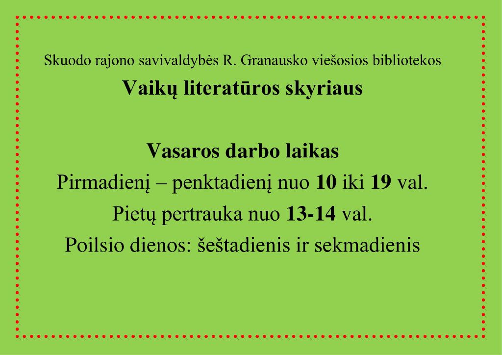 Skuodo rajono savivaldybės R. Granausko viešosios bibliotekos Vaikų literatūros skyrius (Gedimino g. 4, Skuodo meno mokyklos III aukštas) kviečia vaikus skaityti visą vasarą. Vasaros darbo laikas – nuo 10 iki 19 val. darbo dienomis. Pietų pertrauka – nuo 13 iki 14 val. Laukiama atvykstant.